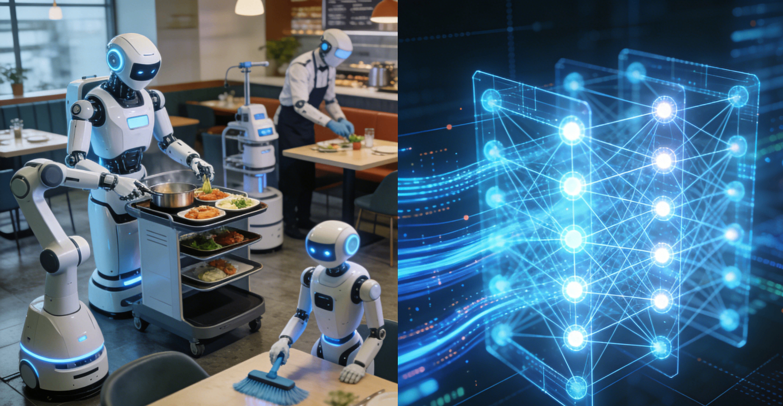 现场 6 类异构机器人(点餐、烹饪、调酒、传菜、清洁、客服)无缝配合,完成从点餐到送餐的全流程服务。这意味着具身智能已突破实验室限制,具备商业化落地能力。