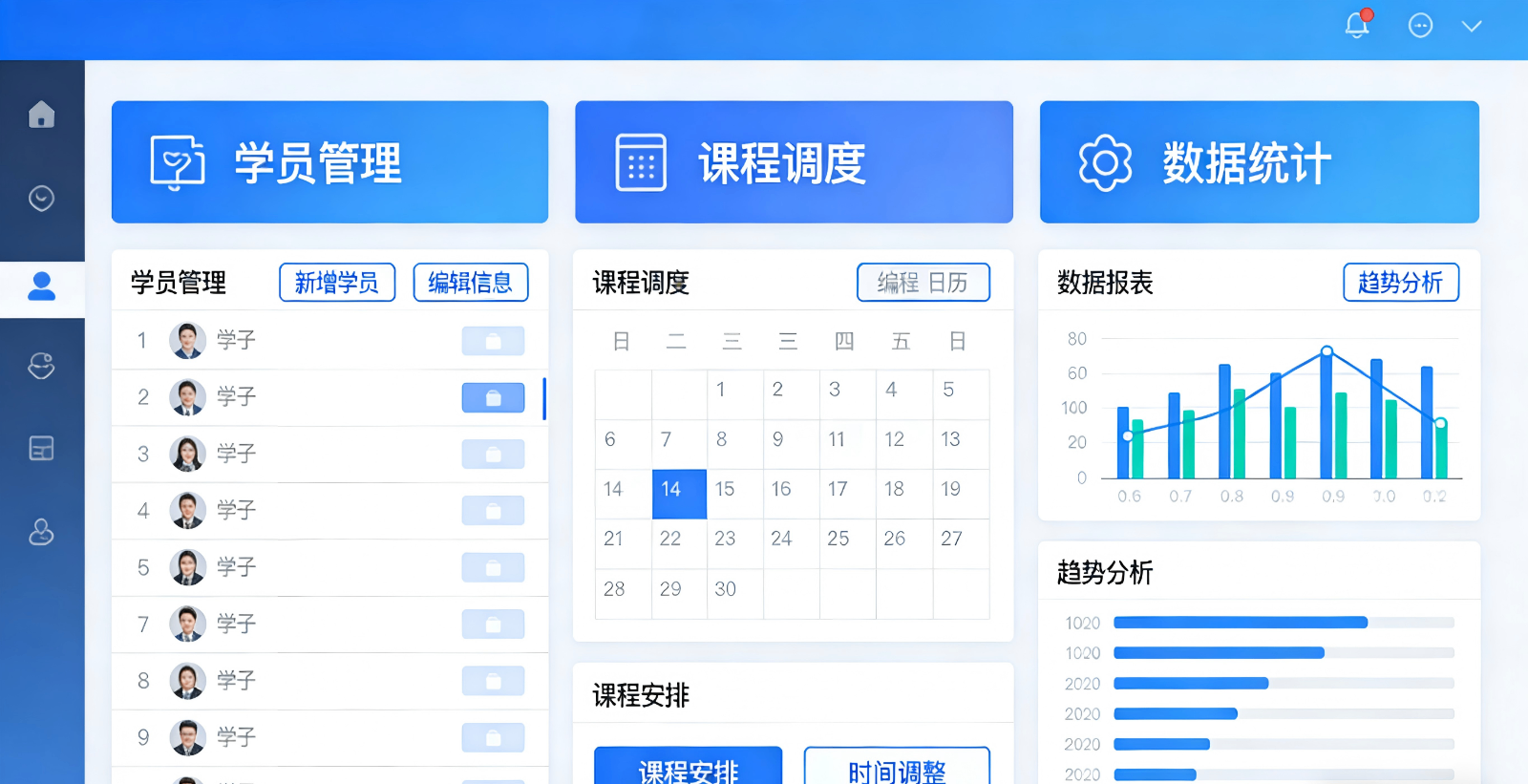 (一)背景挑战(痛点):随着双龙培训学校规模持续扩大,学员数量、课程体系、师资团队不断扩容,传统管理模式的弊端日益凸显,核心痛点集中呈现为三点:一是缺乏统一的核心管理系统,学员报名、课程调度、师资分配、数据统计等环节分散操作,效率低下且易出现数据偏差,增加人工核对成本;二是现有系统兼容性差,无法适配手机、平板、电脑等多终端使用场景,学员选课、教师备课、管理者查数的便捷性不足,影响各方使用体验;三是数据无法实现有效沉淀与分析,难以通过数据洞察学员需求、优化课程设置,无法为学校运营决策提供科学支撑,制约学校规模化发展与核心竞争力提升。在此背景下,双龙培训学校亟需专业的技术合作伙伴,打造一套贴合培训行业需求、适配自身发展的核心软件与系统,破解数字化转型困境。